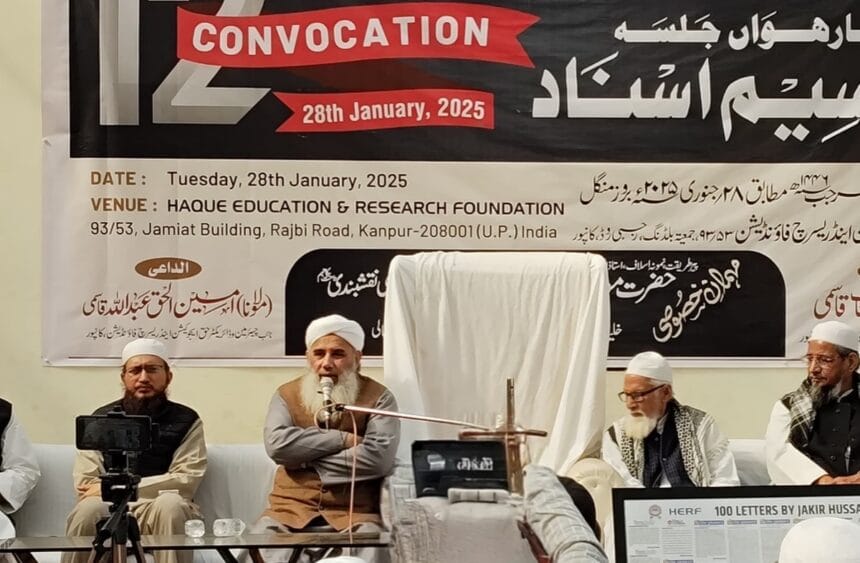 کانپور (محمد عثمان قریشی) حق ایجوکیشن اینڈ ریسرچ فاؤنڈیشن کانپور کا سالانہ جلسہ تقسیم اسناد و انعامات منگل کو صبح 10 بجے جمعیۃ بلڈنگ رجبی روڈ کانپور میں منعقد ہوا. جس میں بطور مہمان خصوصی دارالعلوم دیوبند کے استاذ مولانا محمد سلمان بجنوری نقشبندی نائب صدر جمعیۃ علماء ہند نے شرکت کی۔