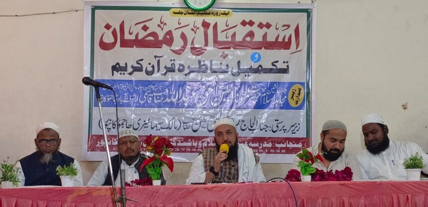 کانپور (محمد عثمان قریشی) جمعیۃ علماء شہر و مجلس تحفظ ختم نبوت کانپور کی جانب سے جاری استقبال رمضان و تفہیم دین پروگرامز کے تحت اکبر مارکیٹ نیلی پوش روڈ کرنیل گنج اور مدرسہ عنایت الاسلام سریاں جاجمؤ میں پروگرام کا انعقاد کیا گیا۔ مدرسہ عنایت الاسلام سریاں میں خطاب کرتے ہوئے مولانا امین الحق عبداللہ قاسمی نے کہا کہ ایمان کی حفاظت کے لئے سب سے بنیادی چیز مدارس اور علماء سے تعلق ہے۔